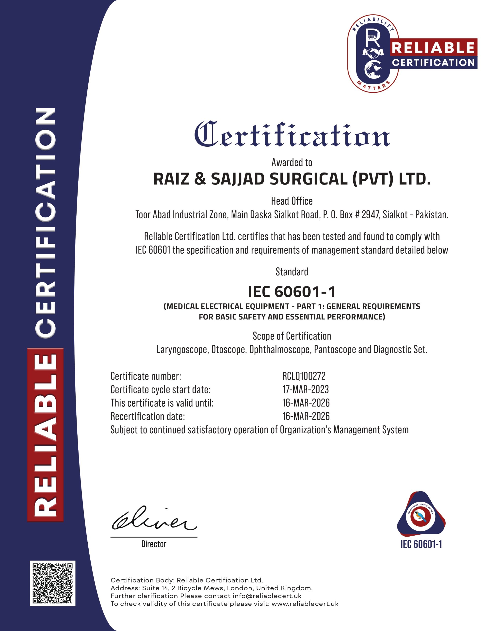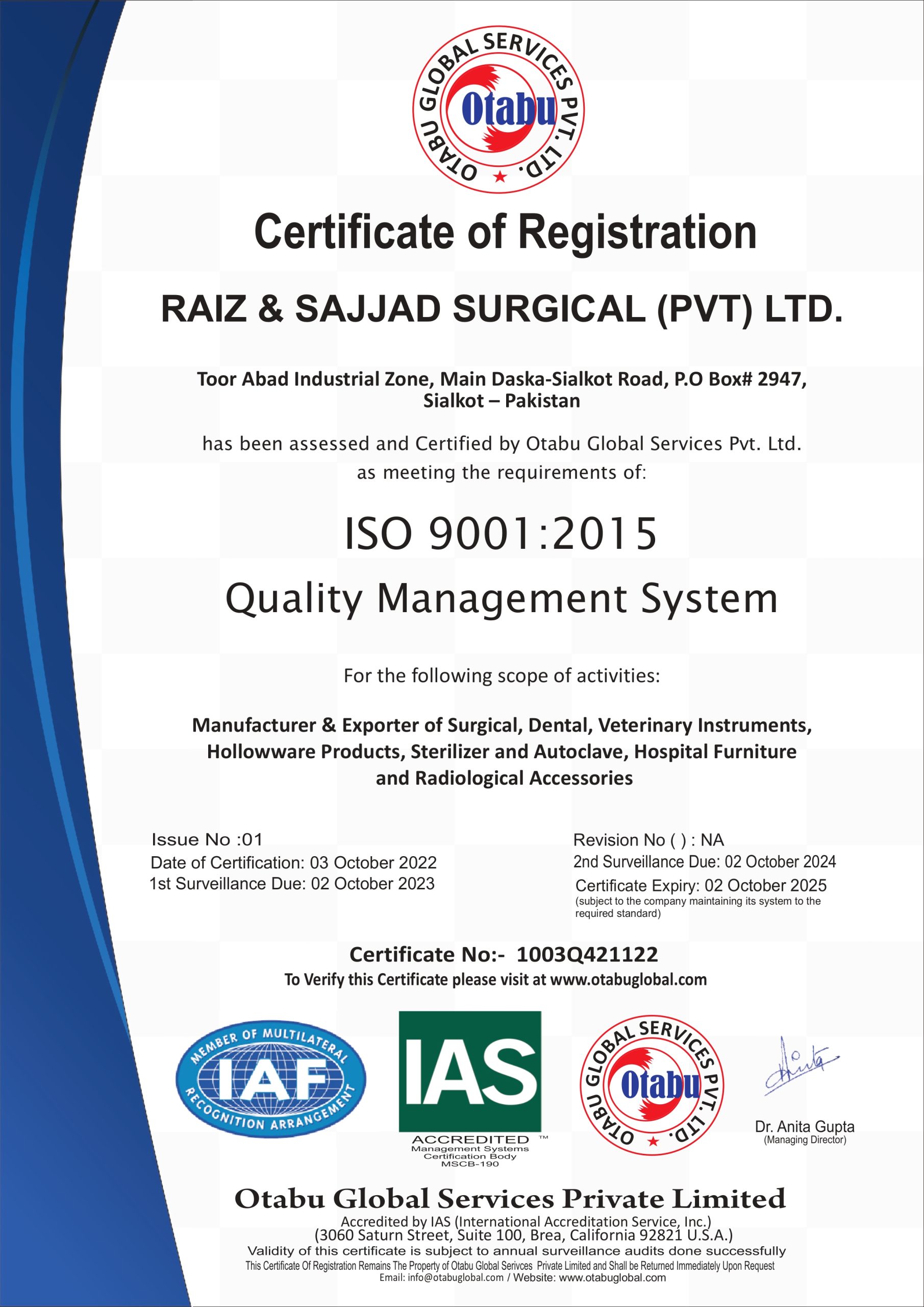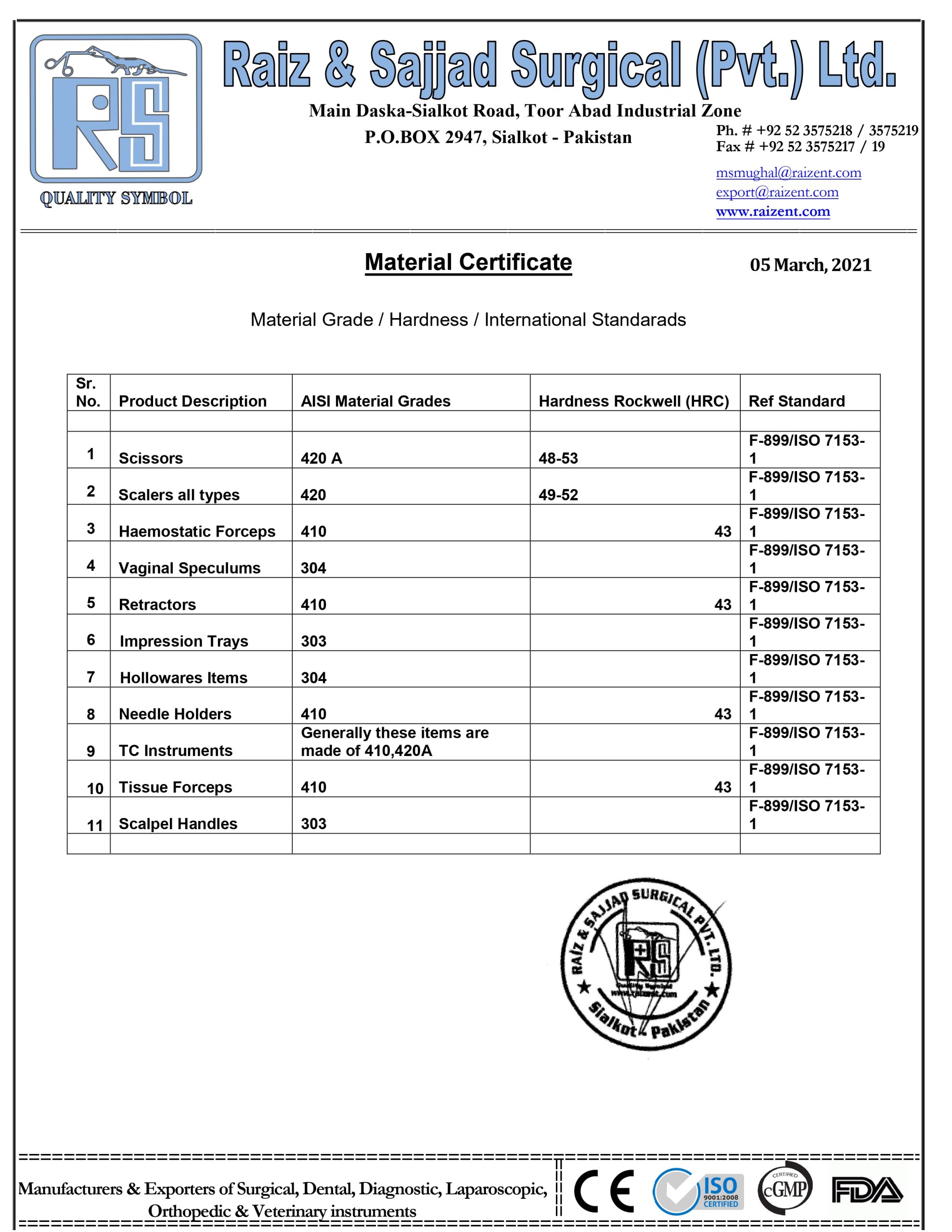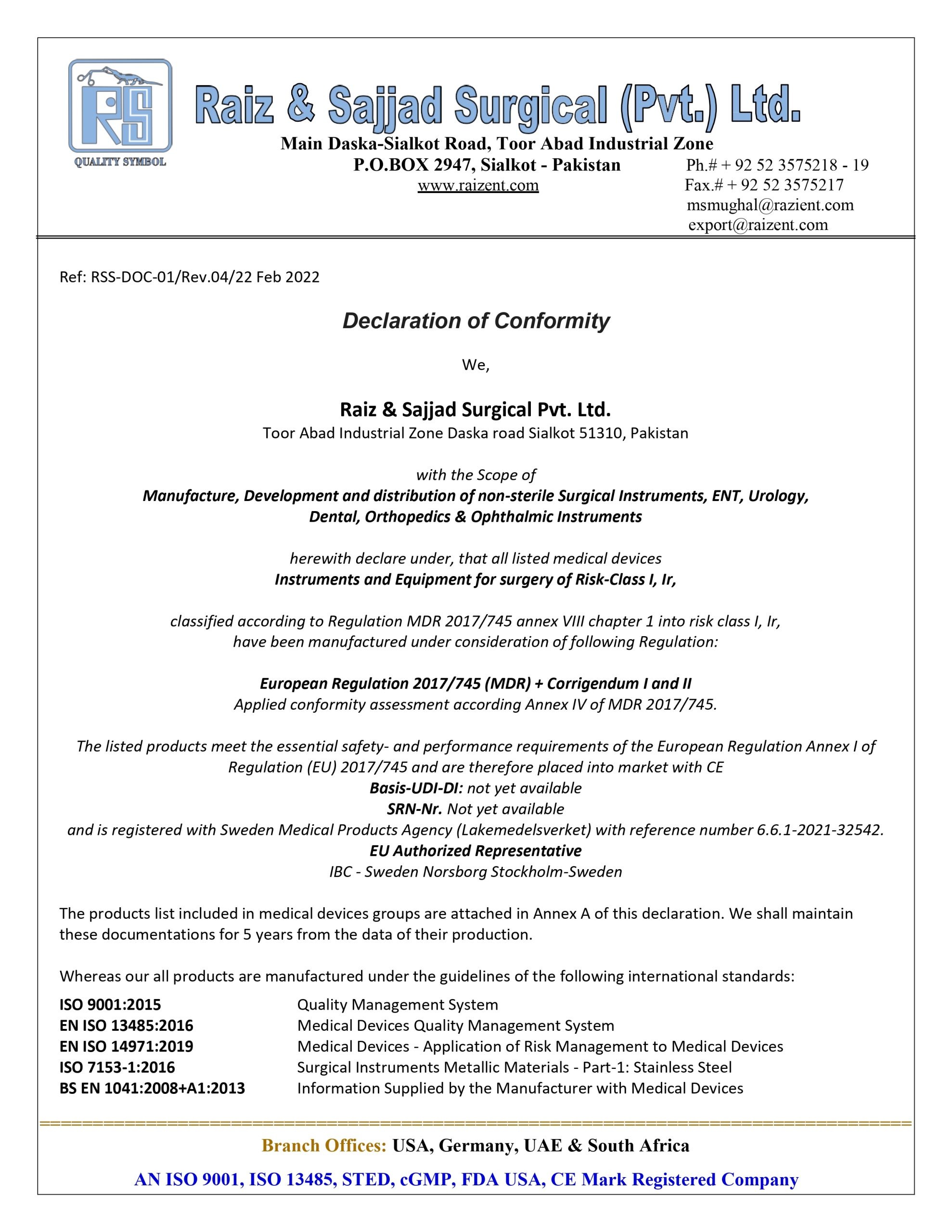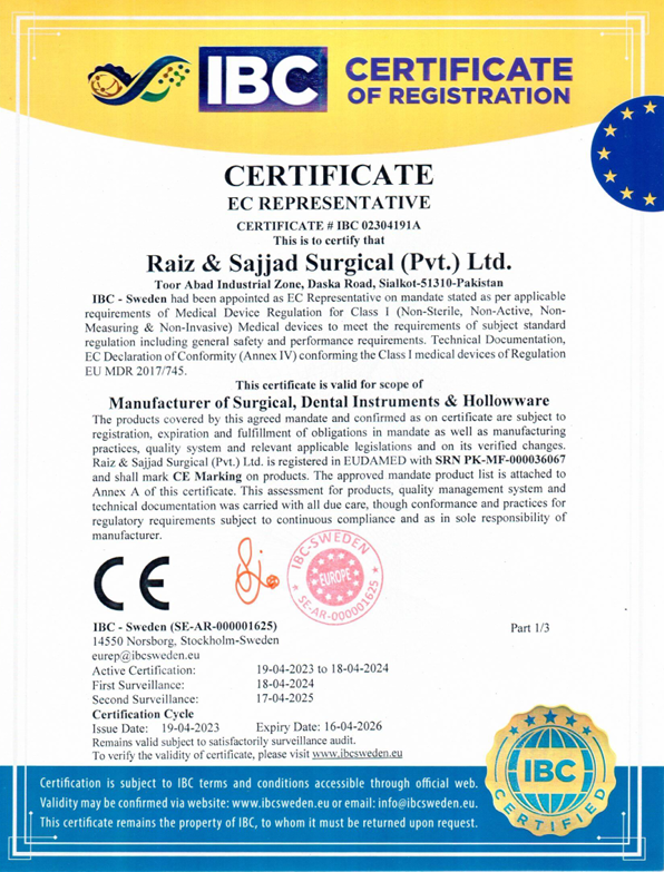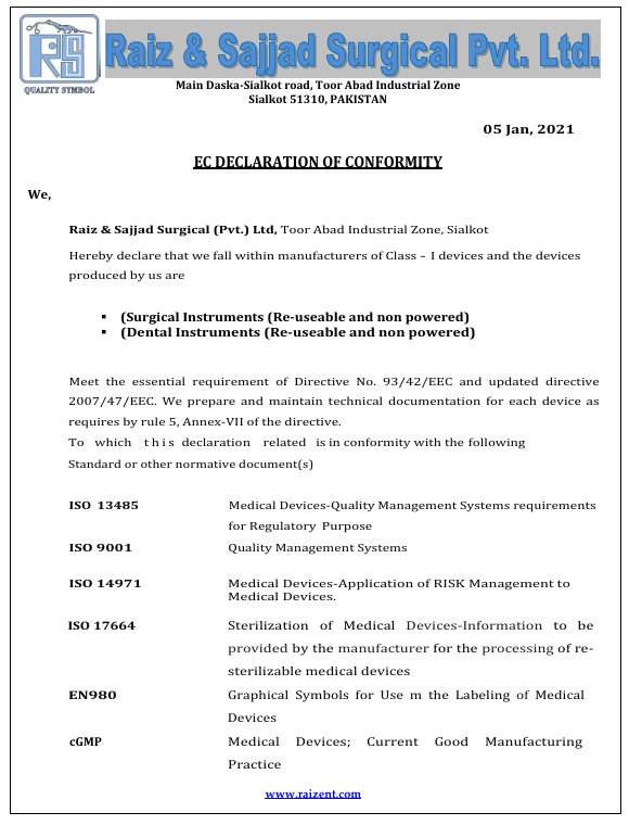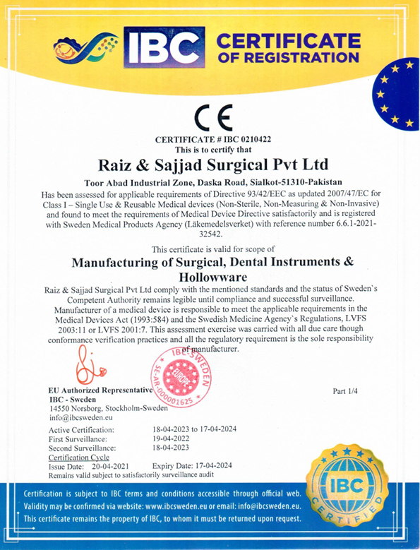 “At Raiz and Sajjad Surgical Instruments, compliance is more than a requirement—it’s our promise. From ISO certifications to rigorous quality control, we ensure every instrument meets international regulatory standards and reflects our unwavering integrity.”